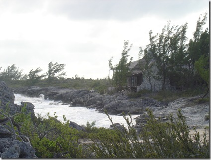 12/24/09 Romeo was up early and ready to go on a long hike to Normans Cay Beach Club to post the blog and spend some time with Dave and Linda for lunch. Linda had loaned some cook books, to Juliette the day before. Juliette had called her on the radio looking for a recipe for pecan pie and peach cobbler, Linda and her husband were planning a walk, so they dropped them off in 25 knot wind and 2 foot waves in the pond. Linda and her husband were quit adventurous going out in the bad weather for a walk and to the deliver the cook books. They were also planning a walk to Normans Beach Club the next day.